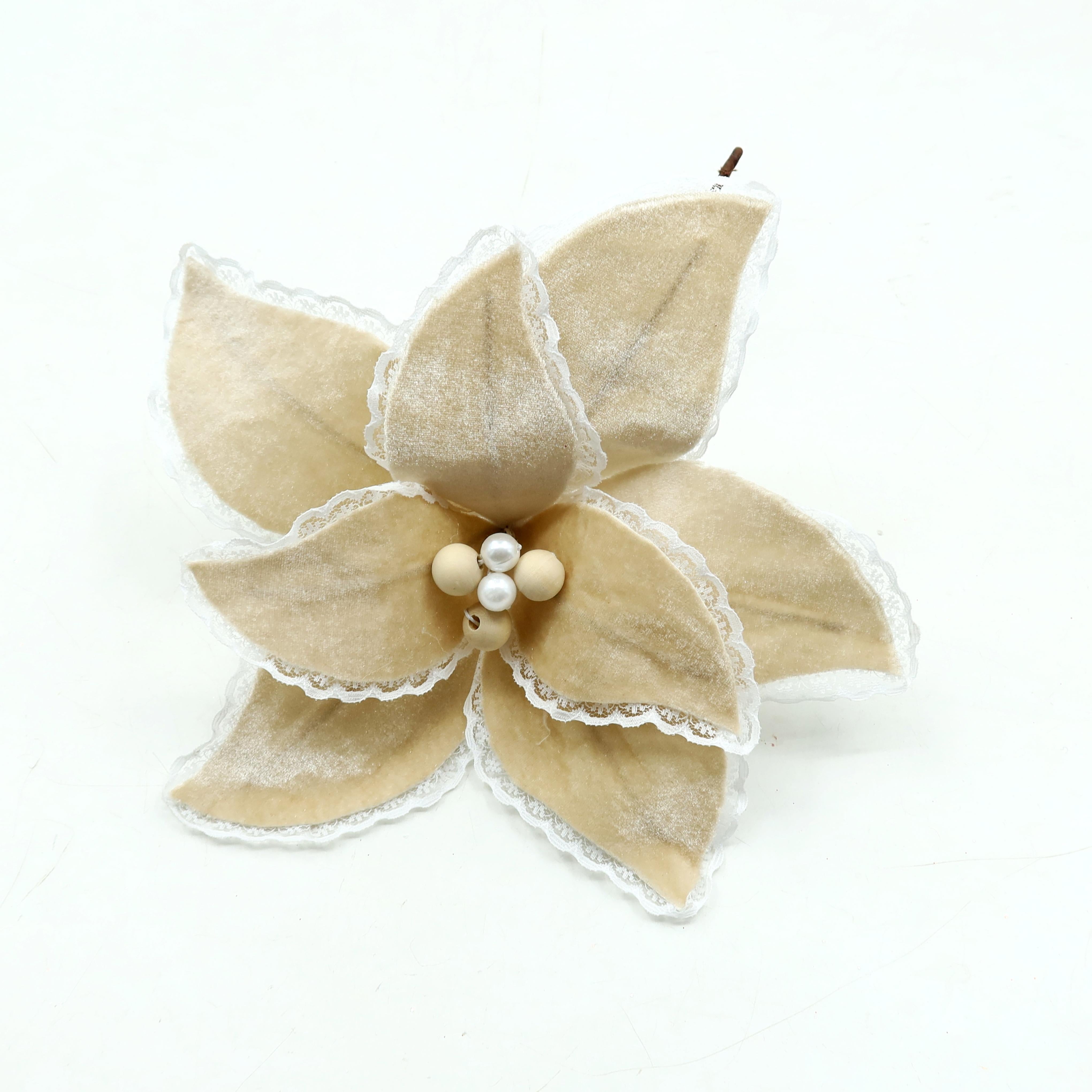 Déjate envolver por la magia navideña con esta elegante flor decorativa, un detalle que aporta brillo y sofisticación a tu árbol, guirnaldas o centros de mesa. Sus pétalos cuidadosamente diseñados evocan la esencia festiva, mientras su tamaño resalta con armonía en cualquier rincón, llenando tu hogar de color, calidez y espíritu navideño.
